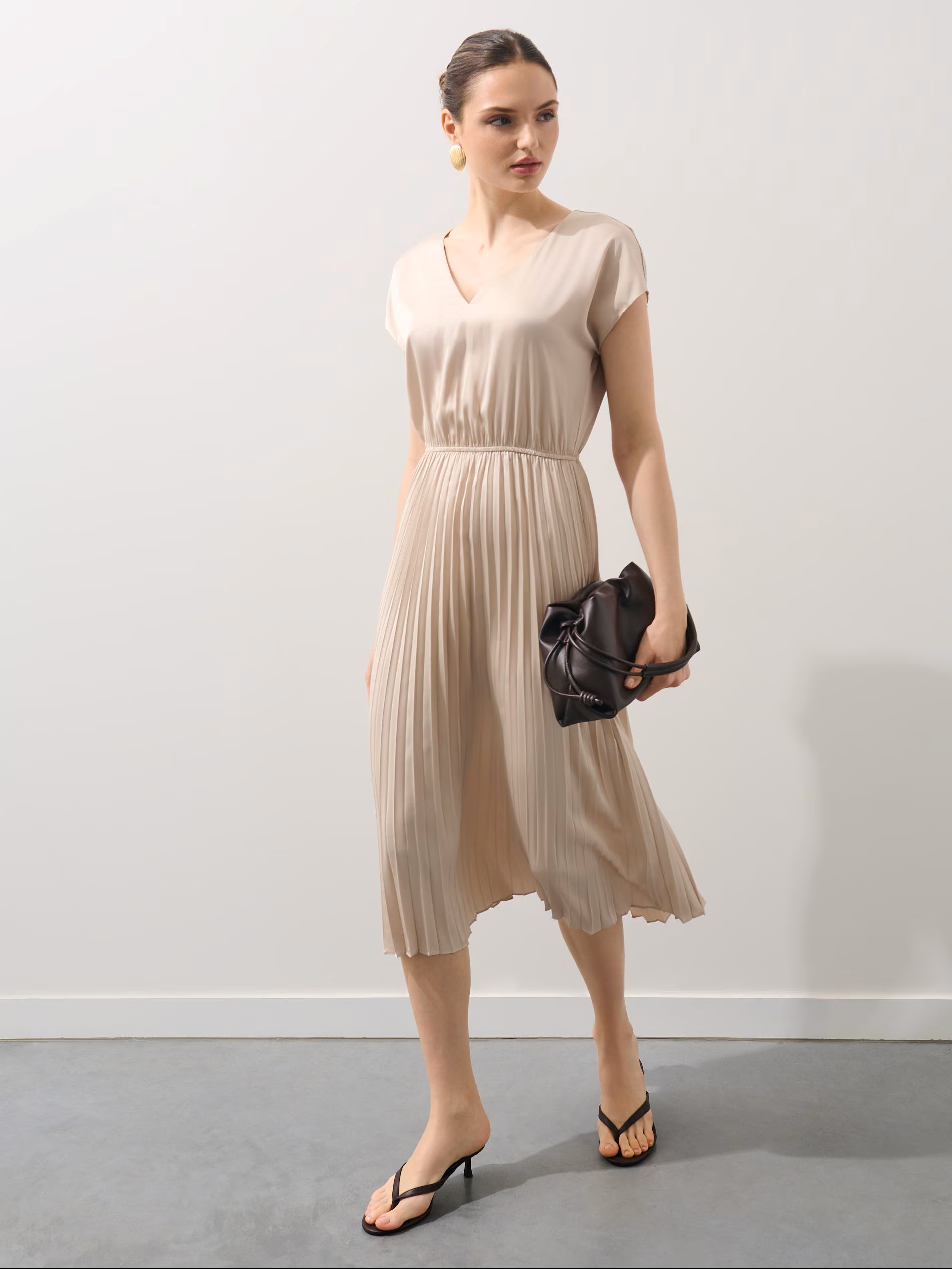 Stílustipp: kombináljuk minimalista, pántos szandállal és finom ékszerekkel, hogy a ruha hangsúlyos sziluettje érvényesülhessen. Ha kontrasztot szeretnénk, választhatunk letisztult lapos cipőt is.