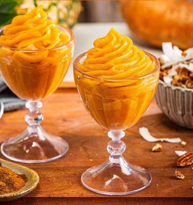 - Keverjük össze a kihűlt édesburgonyát, a fagyasztott ananászt, a juharszirupot, a kókusztejet és 2,5-3 gramm teáskanál sütőtök pite fűszerkeveréket egy konyhai robotgépben; dolgozzuk nagy sebességen simára, időnként lekaparva a tálat.
