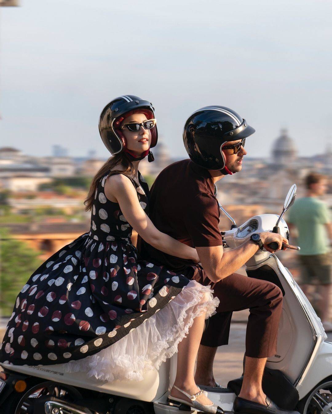 Az állóképeken Collins egy Vespa-robogón ül, egy új férfi társaságában, akárcsak Ann hercegnő a Római vakációban. Máshol a színésznő pont úgy néz ki, mint Hepburn Regina Lampert szerepében az Amerikai fogócska nyitójelenetében.